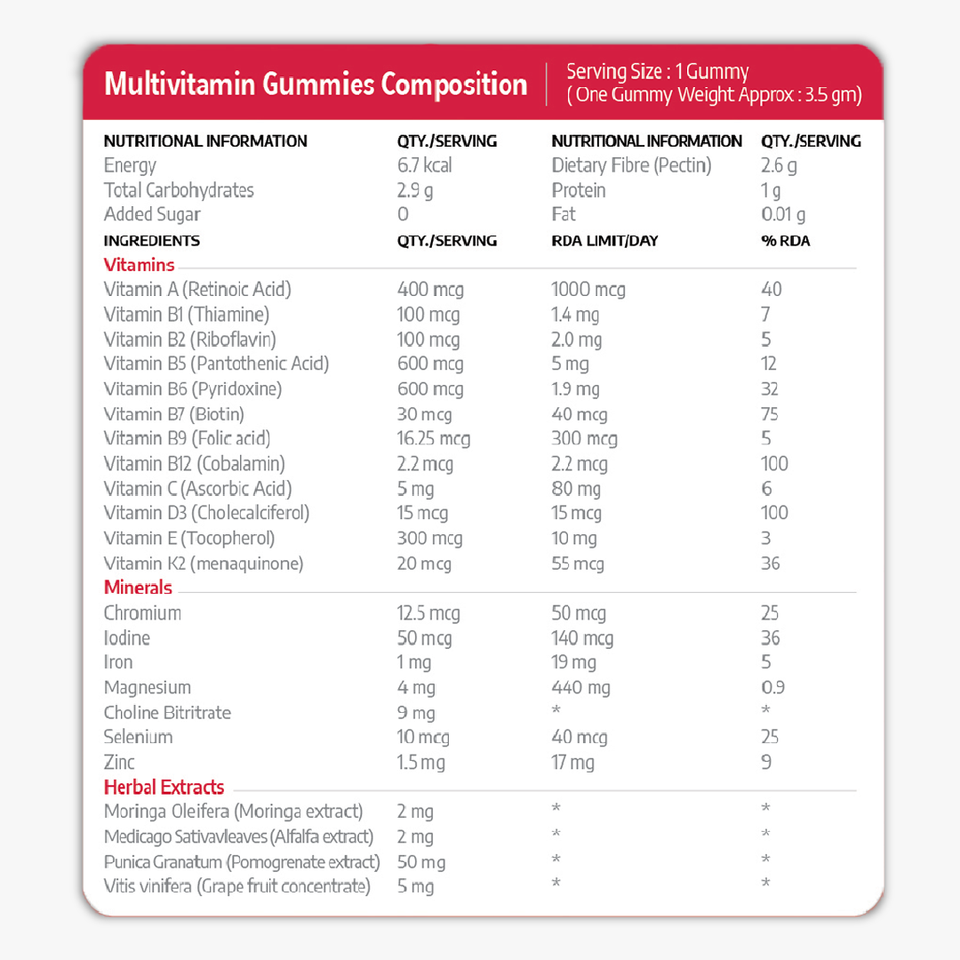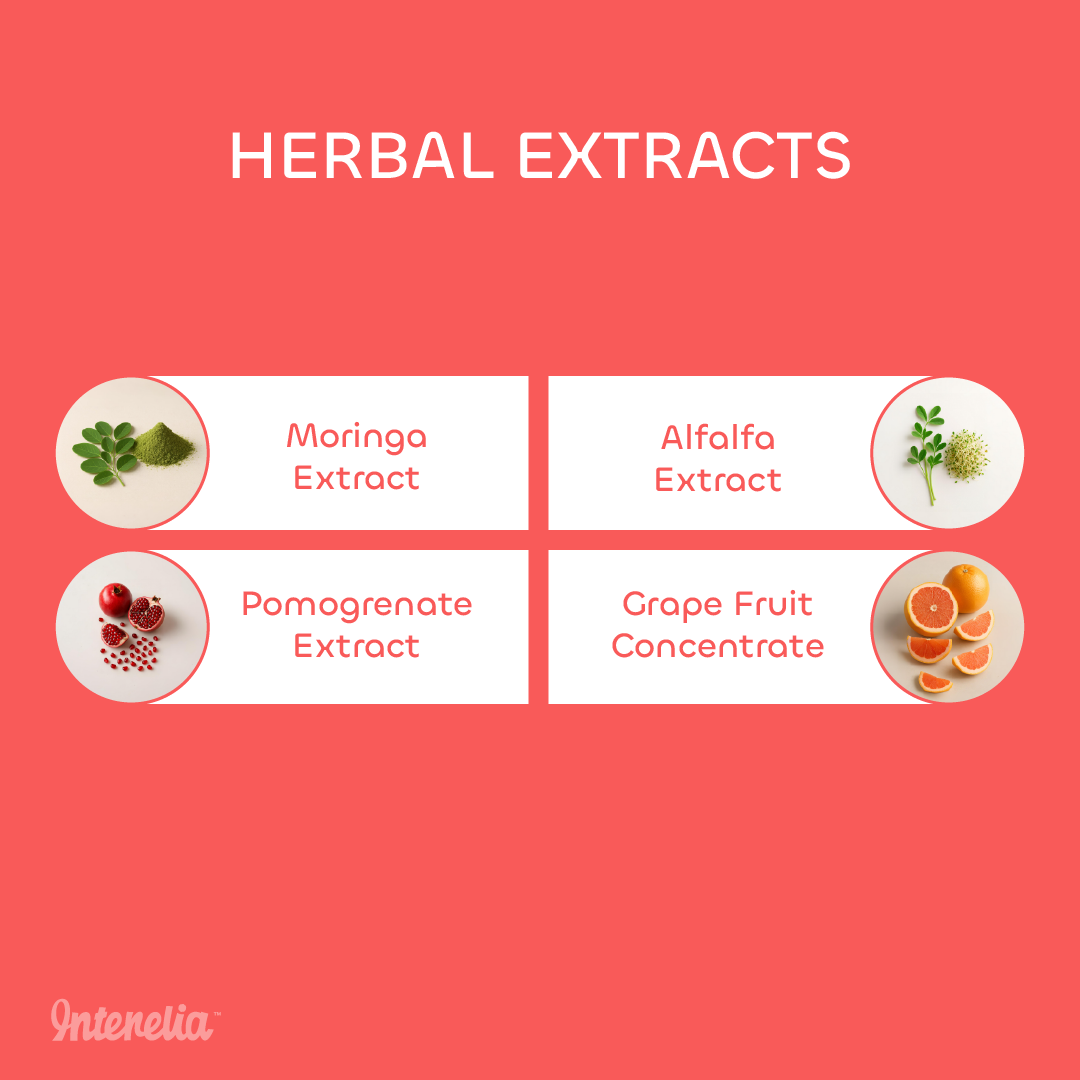 Zinc, Moringa extract, Vitamin B1, Vitamin C, Vitamin B9 (Folate), Vitamin B12, Iron, Vitamin B2, Vitamin E, Magnesium, Choline bitartrate, Pomegranate extract, Grape fruit concentrate, Alfalfa extract, Natural Colour and Flavour.